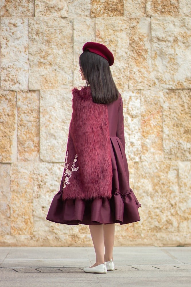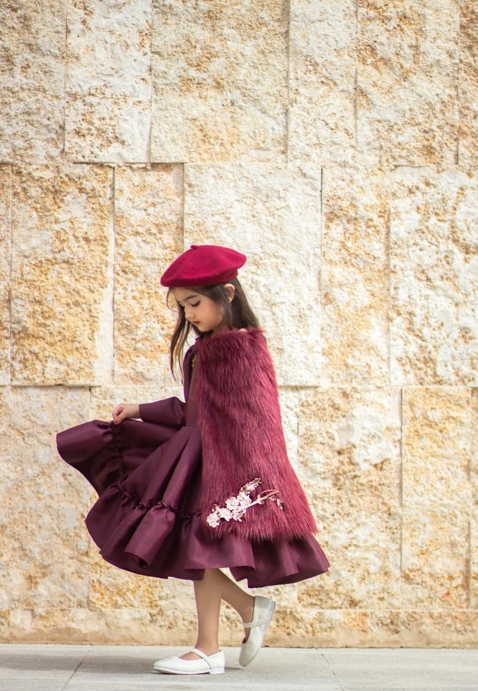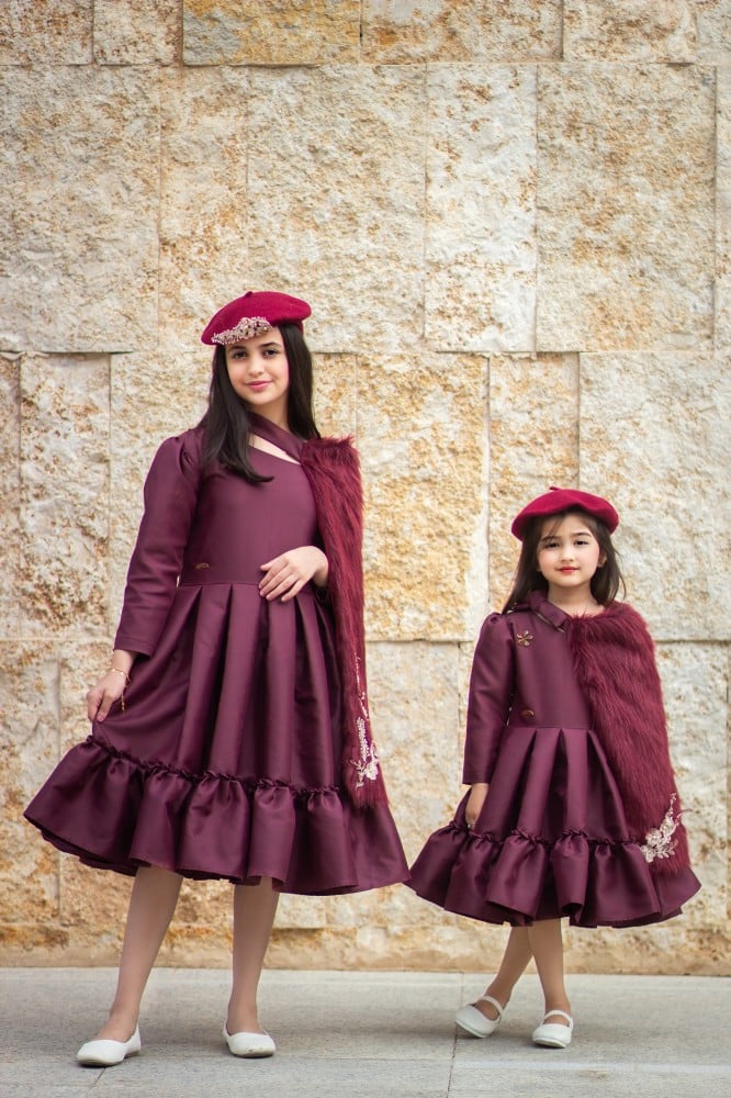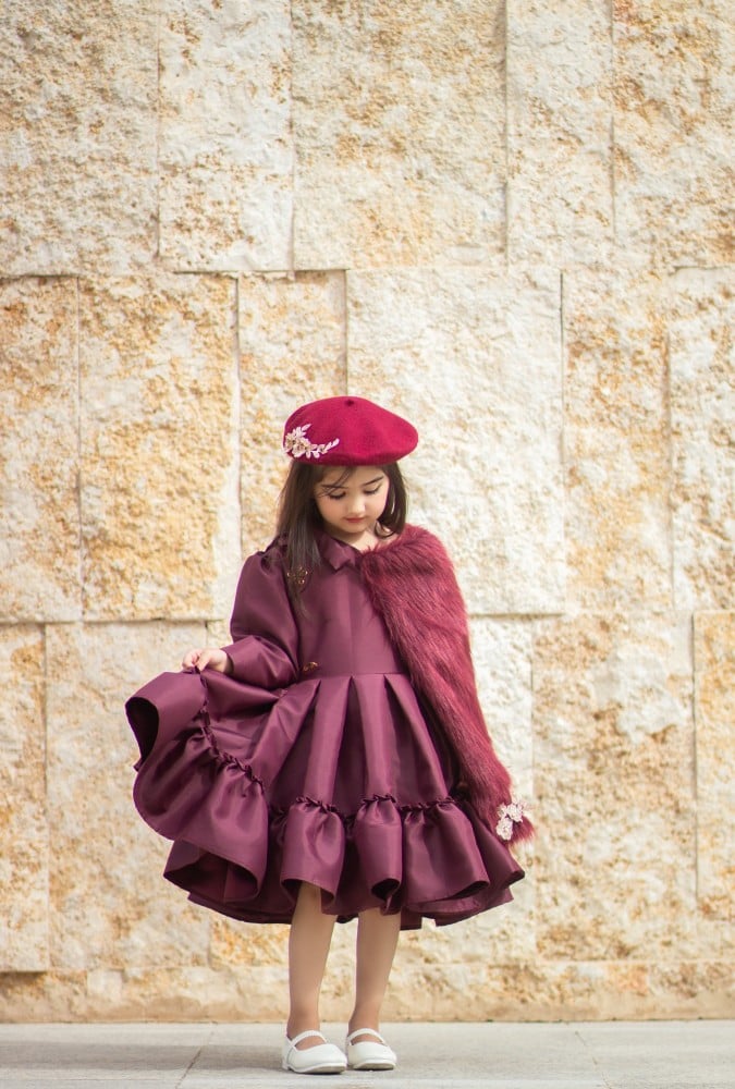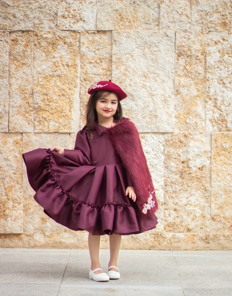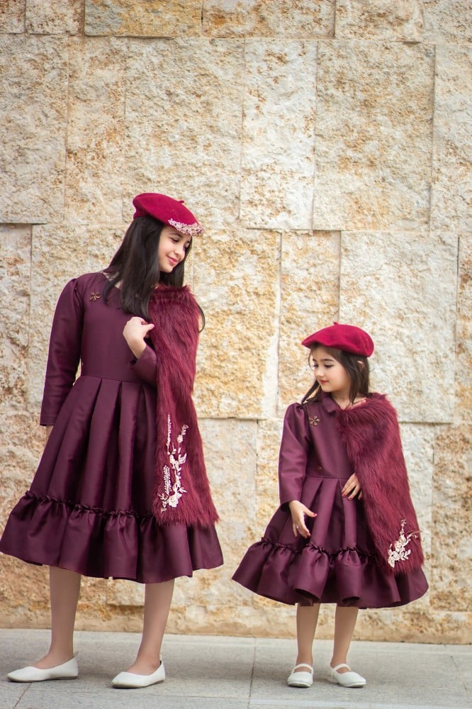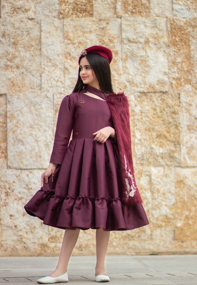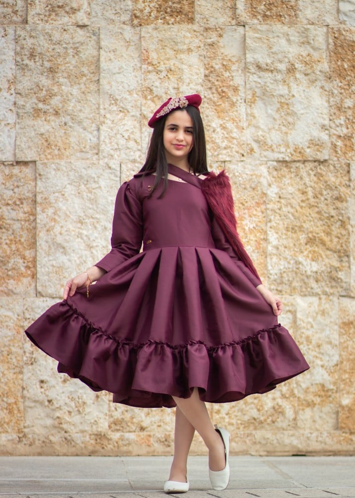 فستان أطفال فاخر من التفته بأكمام طويلة باللون العودي المميز حيث يتناغم الفستان مع قطعة الفرو لتعطيه أناقة مثالية