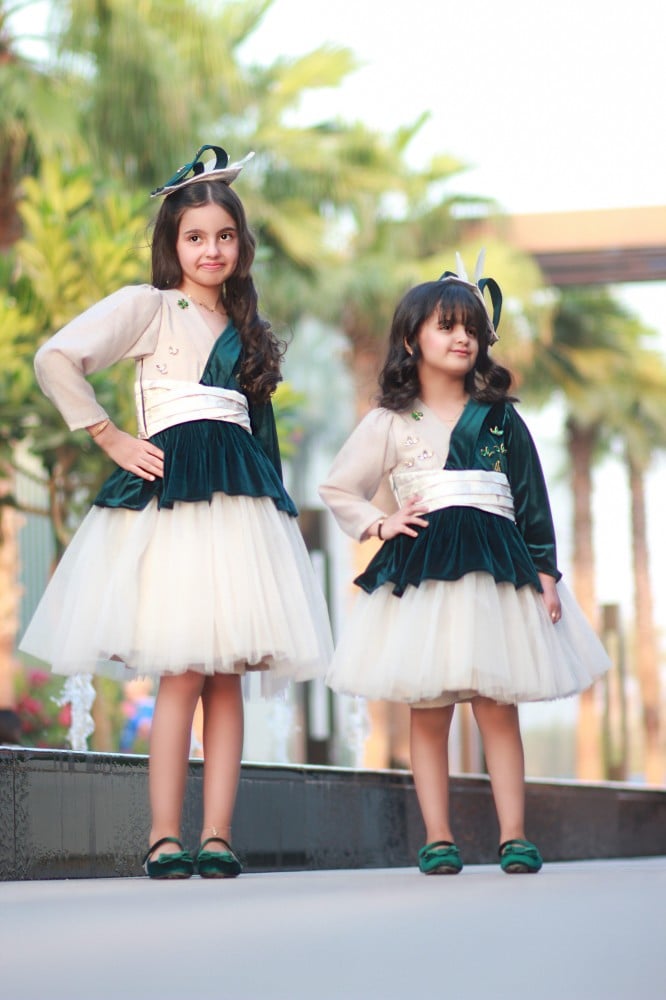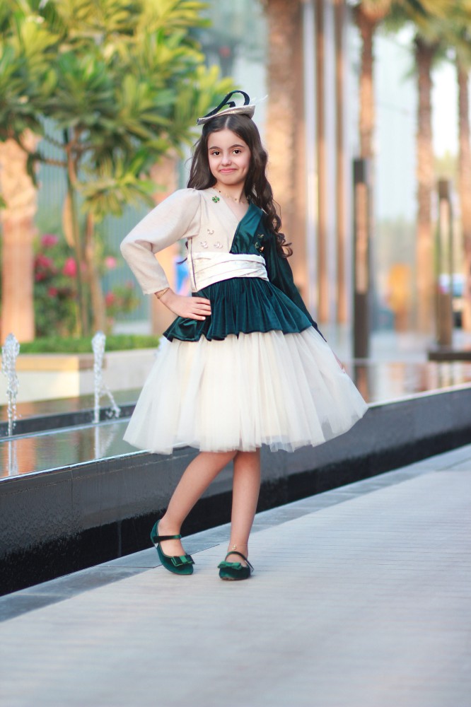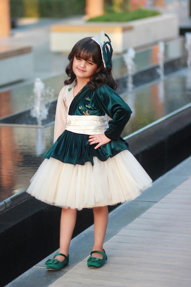 مصنوع من الخام المخمل الزيتي الناعم وطبقات من قماش التل الراقي ليعطي الطفله اكثر أناقة ونعومة وجاذبية