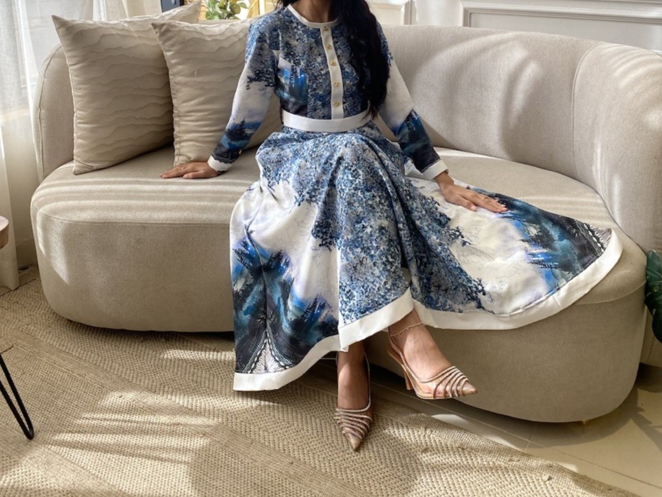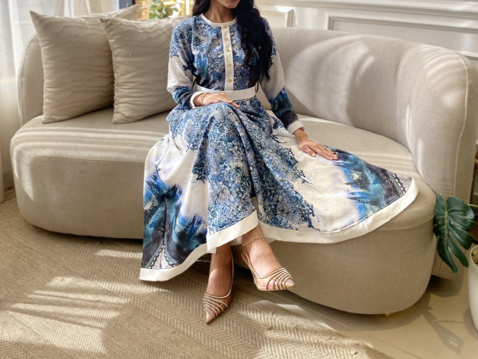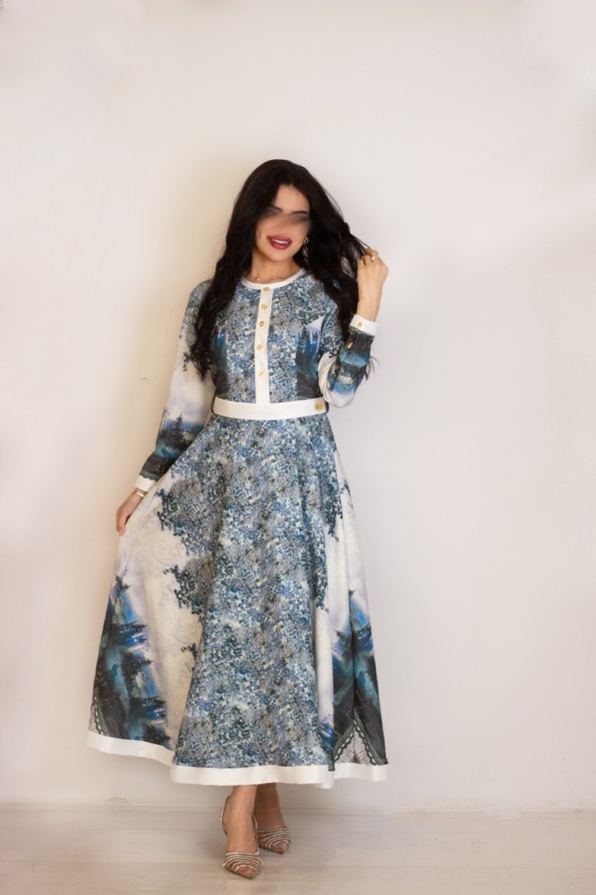 فستان نسائي راقي جذاب ومميز كلوش مكسي درجات اللون الأزرق مصنوع من أجود أنواع الأقمشة التركية
