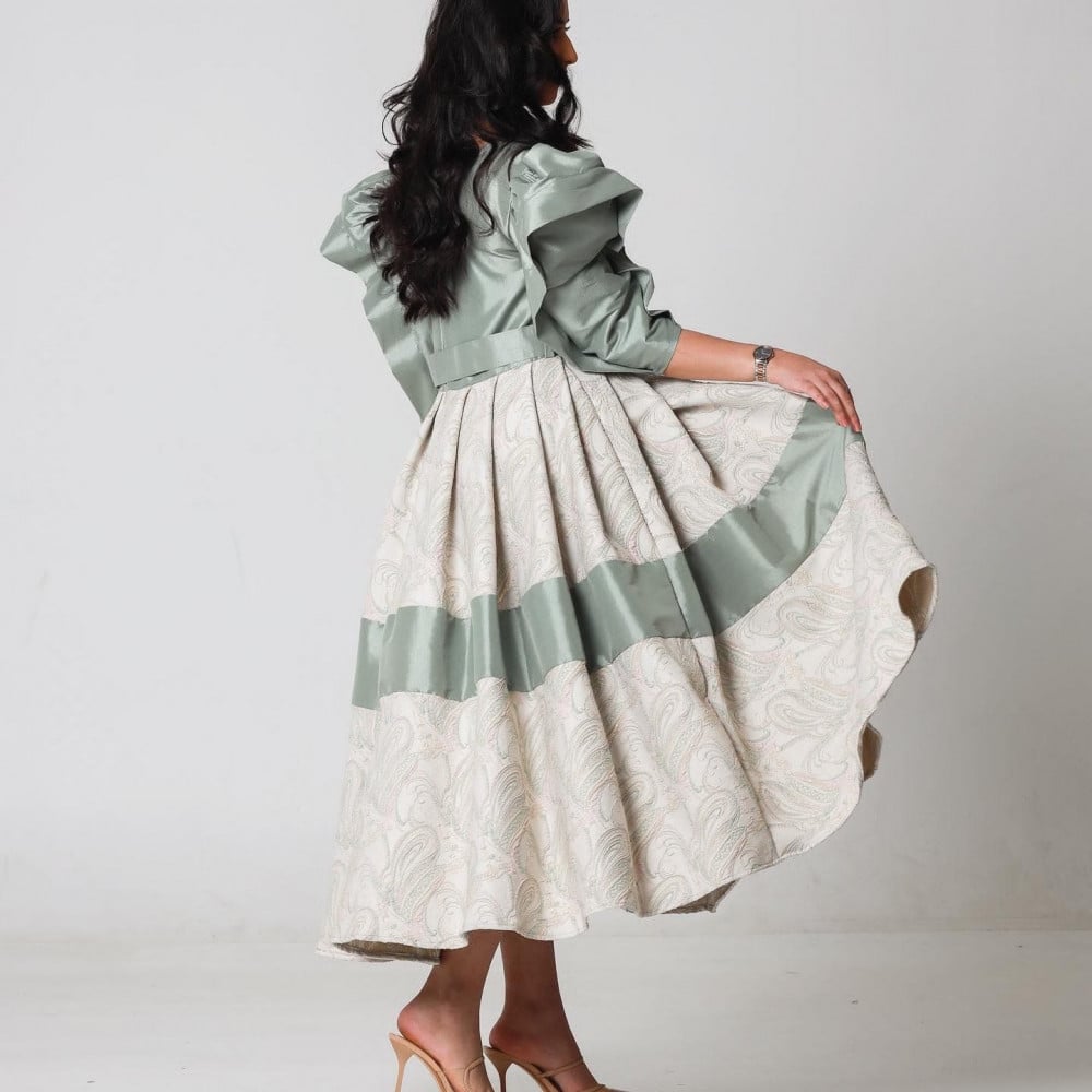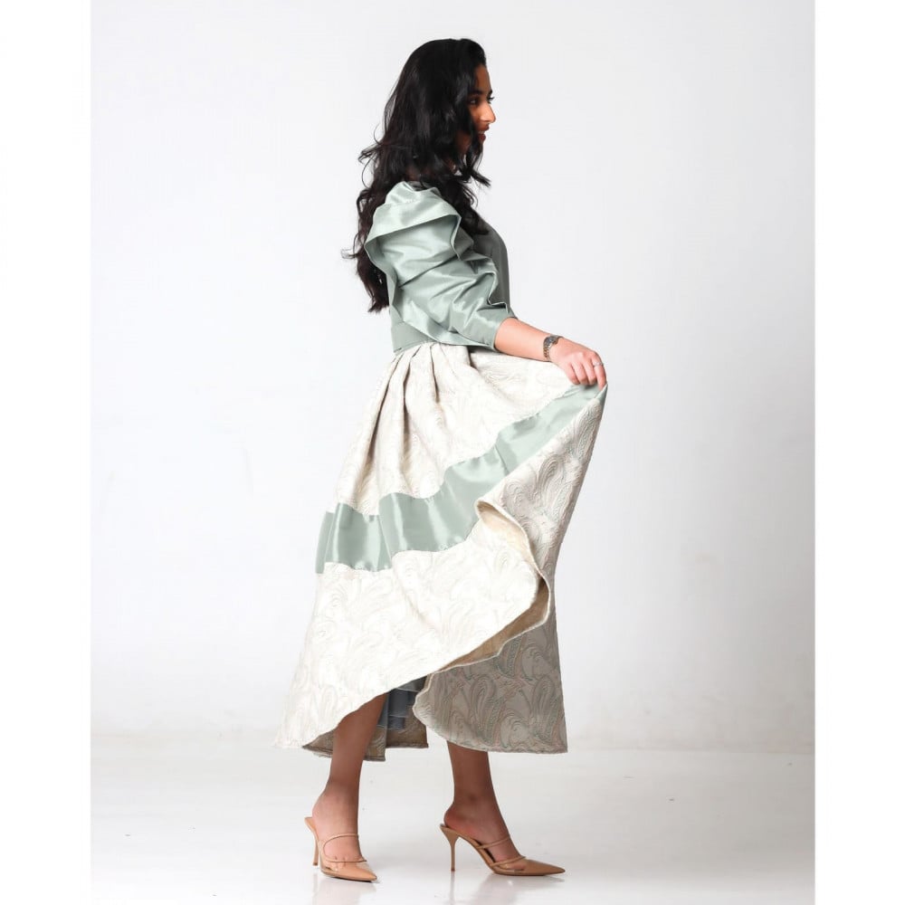 فستان نسائي مصنوع من خامة شانتون متداخله مع الجاكار المشجر